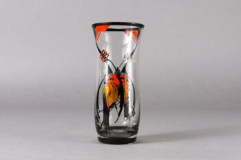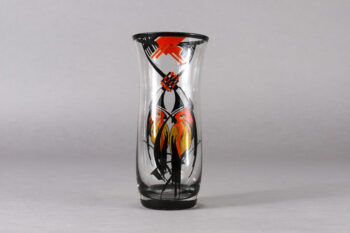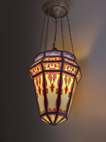 Stained glass cylindrical hanging lamp with bright colors and abstract Amsterdam School patterns.