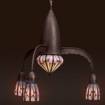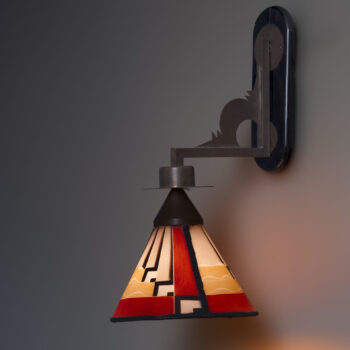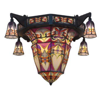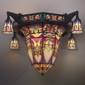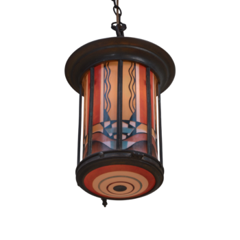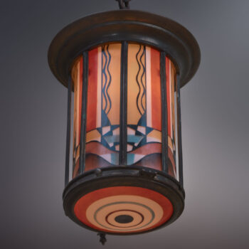 This extraordinary lamp, dating from around 1925, exemplifies the innovative design of De Nieuwe Honsel. Its rare dish-shaped form, crafted with stained glass and enamel, creates a stunning visual effect when illuminated.