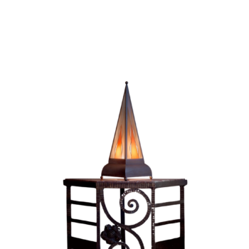 This monumental stained glass lamp, featuring four clock-shaped smaller outer shades, is a stunning example of Amsterdam School style. Its fabulous decoration and intricate design make it a truly unique piece. This lamp was previously featured in the book “Art Nouveau en Art Deco in Nederland” by Frans Leidelmeijer and Daan van Der Cingel, published in 1983.