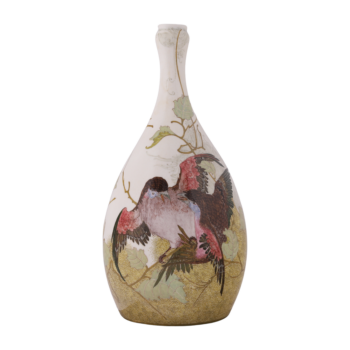 Rozenburg’s eggshell porcelain, first perfected in 1899, became a sensation at the 1900 World Exhibition in Paris, earning international acclaim and being acquired by prestigious museums like the Musée des Beau Arts in Paris and the Victoria and Albert Museum in London. The factory’s porcelain, characterized by its delicate, thin walls and intricate designs, remains a highlight of Art Nouveau in the Netherlands. The decor often reflects Asian influences, featuring motifs such as flowers, birds, fish, and insects. This vase is a pristine example of the artistic and cultural significance of Rozenburg’s work.
