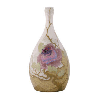Rozenburg’s eggshell porcelain, first perfected in 1899, became a sensation at the 1900 World Exhibition in Paris, earning international acclaim and being acquired by prestigious museums like the Musée des Beau Arts in Paris and the Victoria and Albert Museum in London. The factory’s porcelain, characterized by its delicate, thin walls and intricate designs, remains a highlight of Art Nouveau in the Netherlands. The decor often reflects Asian influences, featuring motifs such as flowers, birds, fish, and insects. This vase is a pristine example of the artistic and cultural significance of Rozenburg’s work.