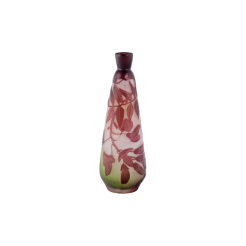 This design was influenced by the renowned Kunstaardewerk Rozenburg and applied to the successful eggshell porcelain style. However, unlike the fragile eggshell porcelain, this South Holland vase is crafted with a thicker shard and a different clay composition, giving it a sturdier feel. Early production of this vase, between 1907 and 1910, involved time-consuming decoration techniques, which later evolved as the filling techniques changed, with the curved lines eventually disappearing from the process.