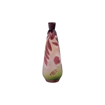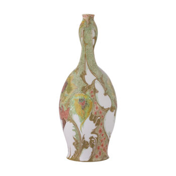 This design was influenced by the renowned Kunstaardewerk Rozenburg and applied to the successful eggshell porcelain style. However, unlike the fragile eggshell porcelain, this South Holland vase is crafted with a thicker shard and a different clay composition, giving it a sturdier feel. Early production of this vase, between 1907 and 1910, involved time-consuming decoration techniques, which later evolved as the filling techniques changed, with the curved lines eventually disappearing from the process.