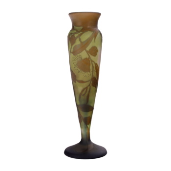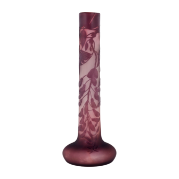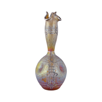 This exquisite vase, crafted around 1900 by Quezal, an esteemed American glass company, features a mesmerizing pearlescent glaze with a radiant, iridescent finish. The vase is adorned with silver thistles in an organic Art Nouveau style, adding a touch of natural elegance. Standing at 29.4 cm (11.6 inches) tall, this signed piece is a beautiful example of Quezal’s mastery in glasswork during the Art Nouveau era, showcasing a harmonious blend of craftsmanship and artistic design.