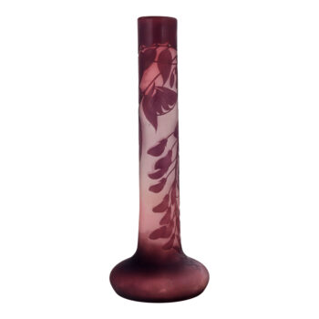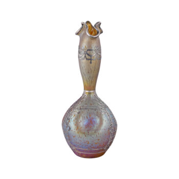 This exquisite vase, crafted around 1900 by Quezal, an esteemed American glass company, features a mesmerizing pearlescent glaze with a radiant, iridescent finish. The vase is adorned with silver thistles in an organic Art Nouveau style, adding a touch of natural elegance. Standing at 29.4 cm (11.6 inches) tall, this signed piece is a beautiful example of Quezal’s mastery in glasswork during the Art Nouveau era, showcasing a harmonious blend of craftsmanship and artistic design.